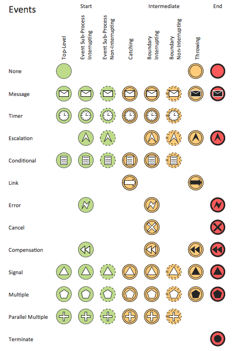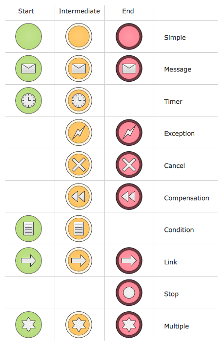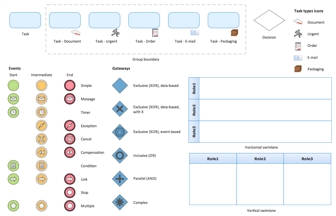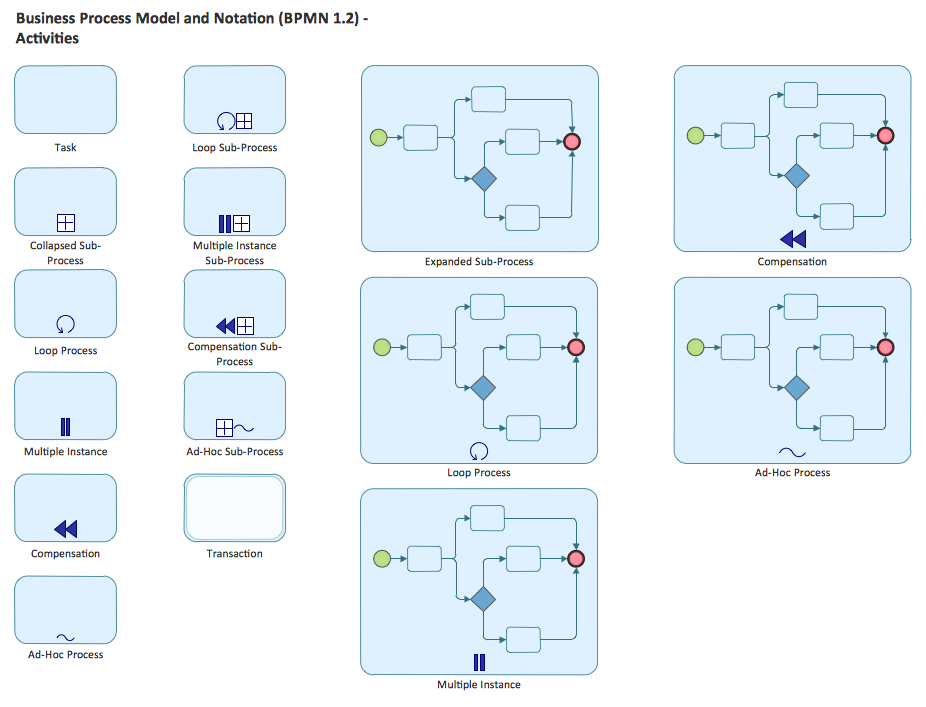 The possibility to easy create professional-looking and attractive Process Flowcharts, Business Process Diagrams and Maps which visualize the steps of complex processes is provided by Business Process Diagram Solution from the Business Processes Area of ConceptDraw Solution Park. This solution includes 16 libraries with 230 process flowchart symbols from BPMN 1.2 and BPMN 2.0.