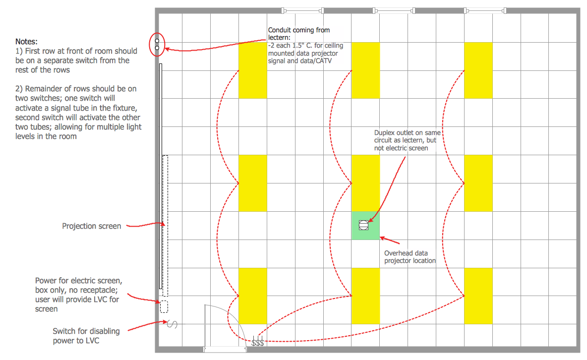 This sample was created in ConceptDraw DIAGRAM using the Reflected Ceiling Plans Solution from the Building Plans area and shows the ceiling idea for the computer classroom. An experienced user spent 5 minutes creating this sample.