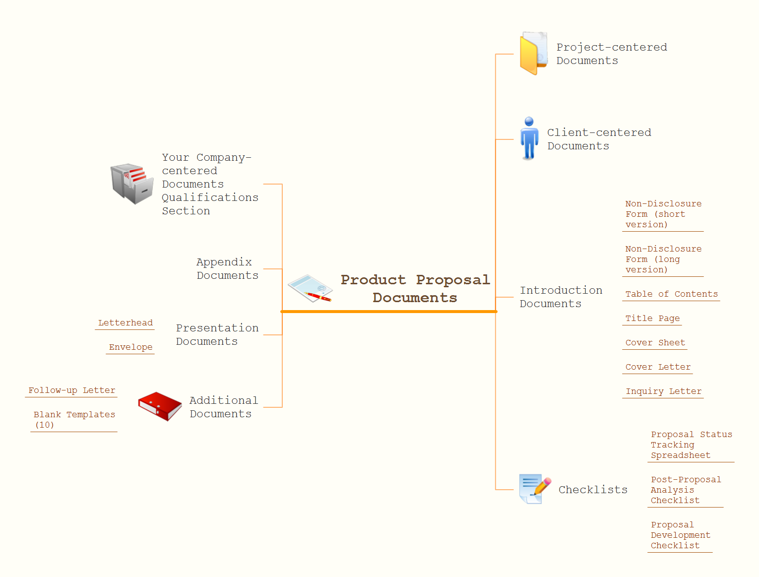 Product Proposal Data document mind map sample is created using ConceptDraw MINDMAP mind mapping software. This mind map example helps to learn how to share and present business documents to team via Skype.
