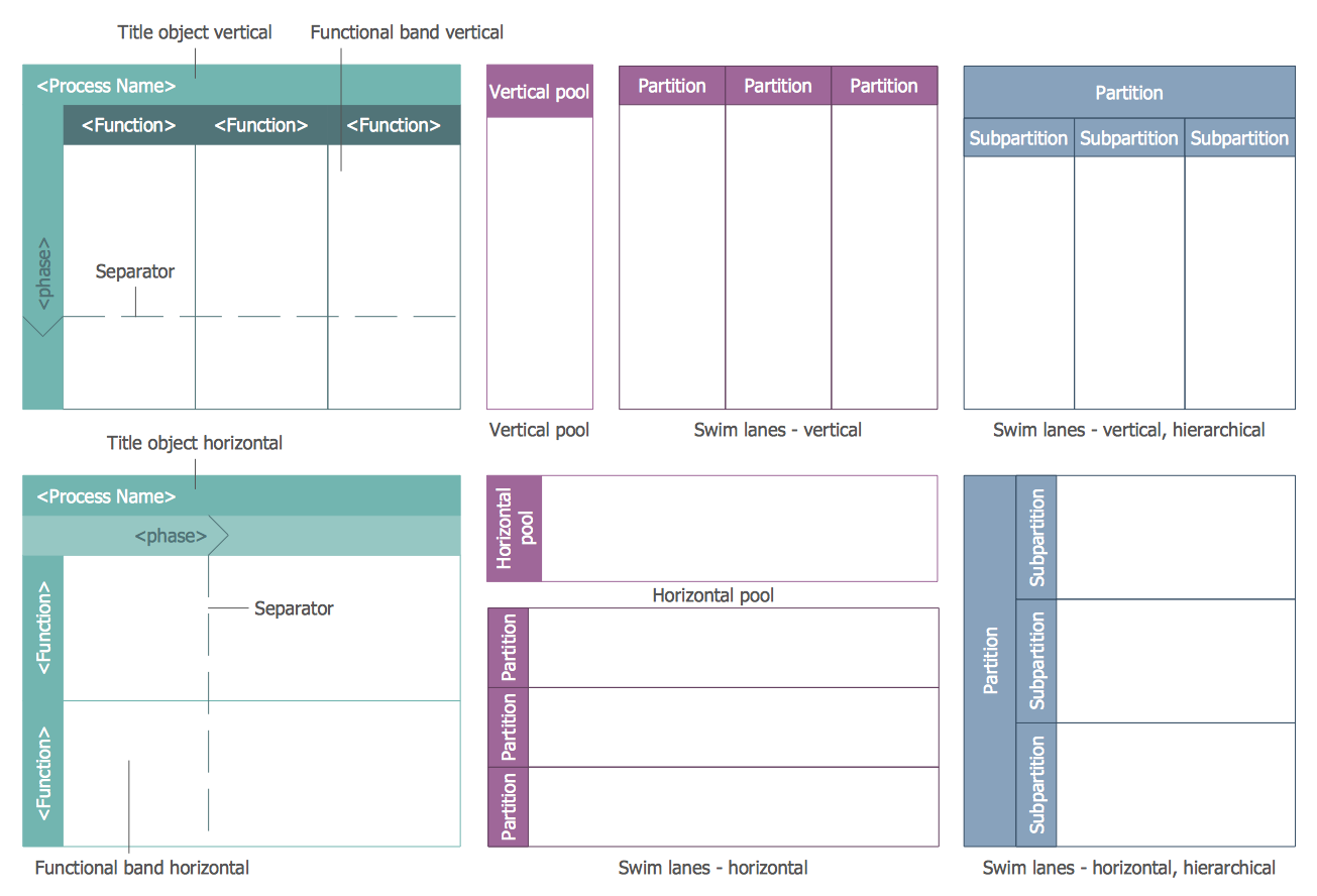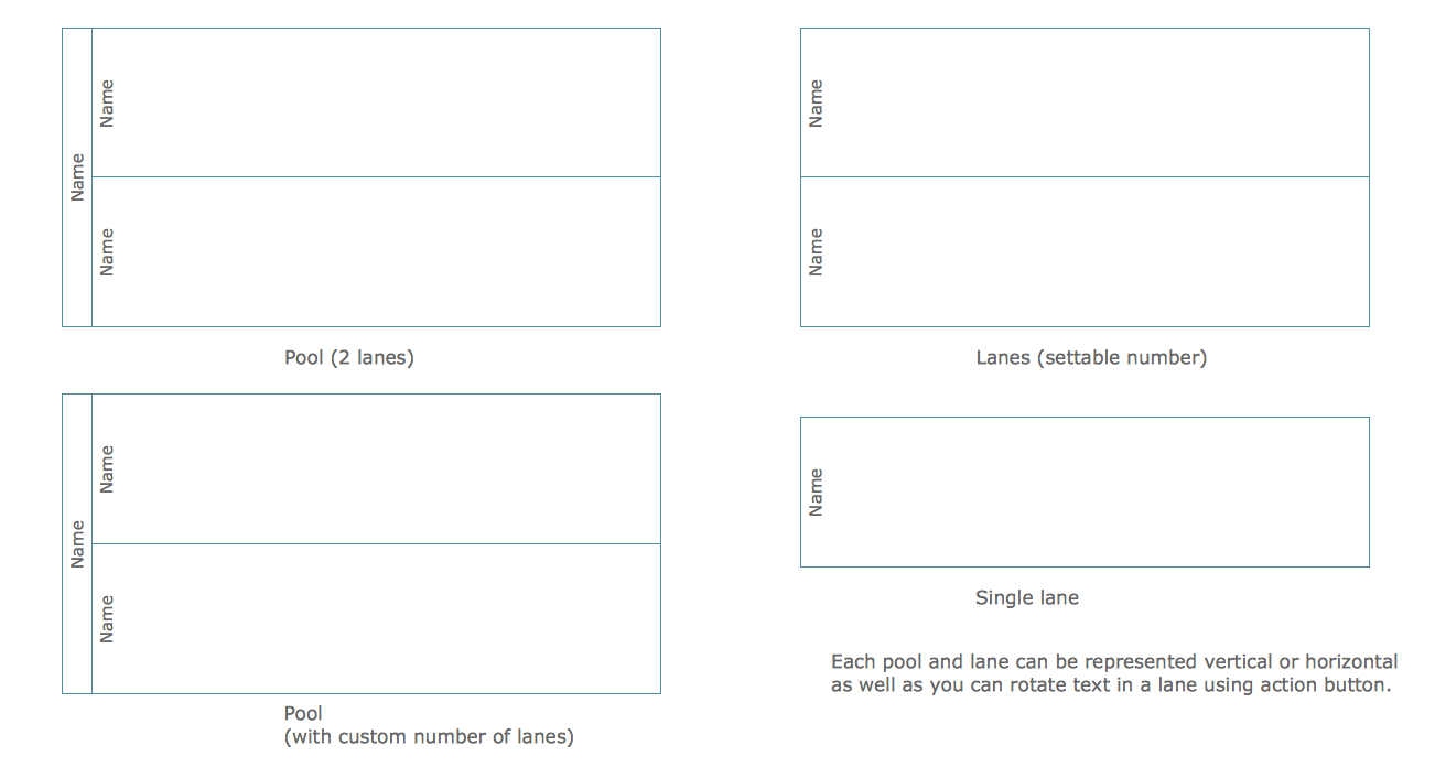 The Swimlanes library from the Business Process Diagram solution contains 20 elements of vertical/horizontal pools and lanes, and flows; Swimlanes BPMN 1.2 library from the Business Process Diagram solution contains 8 vector elements; Swim Lanes library from the Business Process Mapping solution contains 12 vector elements.