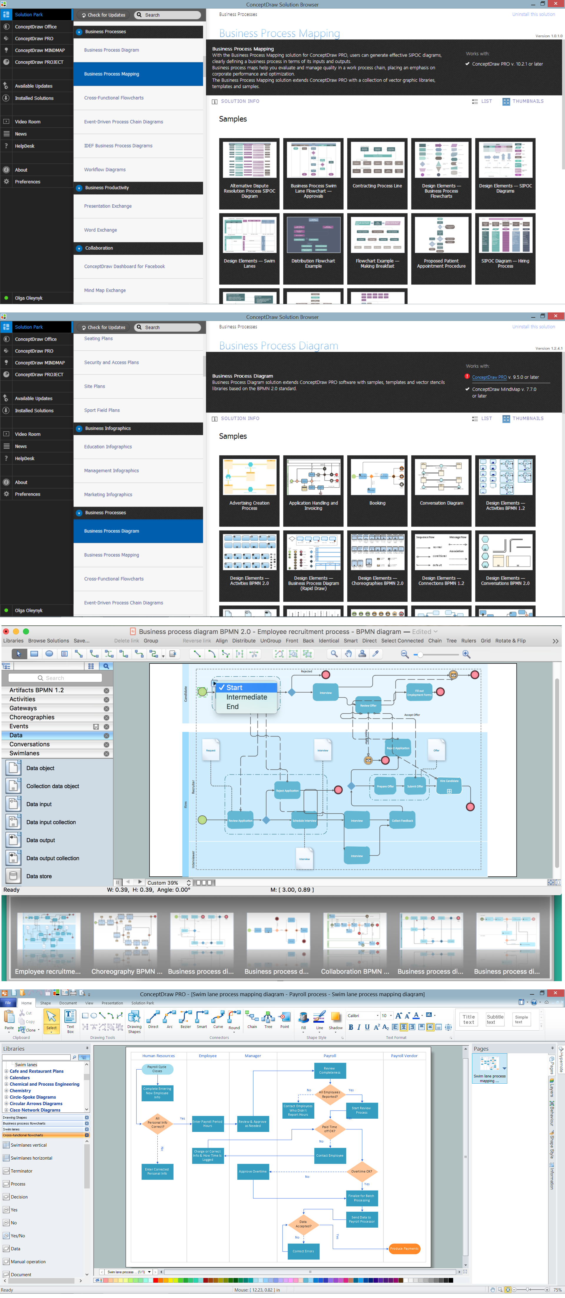 Use the offered variety of swim lane flowchart symbols from the libraries of Business Process Mapping and Business Process Diagram solutions for ConceptDraw DIAGRAM diagramming and vector drawing software and also collection of professionally developed Diagrams, Maps and Swim Lane Flowchart samples and templates from ConceptDraw STORE to get the perfect results in flowcharting design quick, easy and effective.