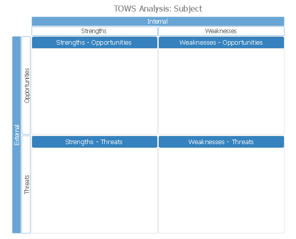 SWOT and TOWS Matrix Diagrams solution extends ConceptDraw DIAGRAM and ConceptDraw MINDMAP software with easy-to-use SWOT analysis tools for SWOT analysts, marketing specialists, investors, business founders, competitors, and other stakeholders. The SWOT and TOWS Matrix Diagrams solution contains Mind Map templates to be filled in, SWOT matrices templates, and vector stencils. Pre-made templates ensure a structured approach, allow users to identify strengths, weaknesses, opportunities, and threats, and organize them easily within the SWOT framework.