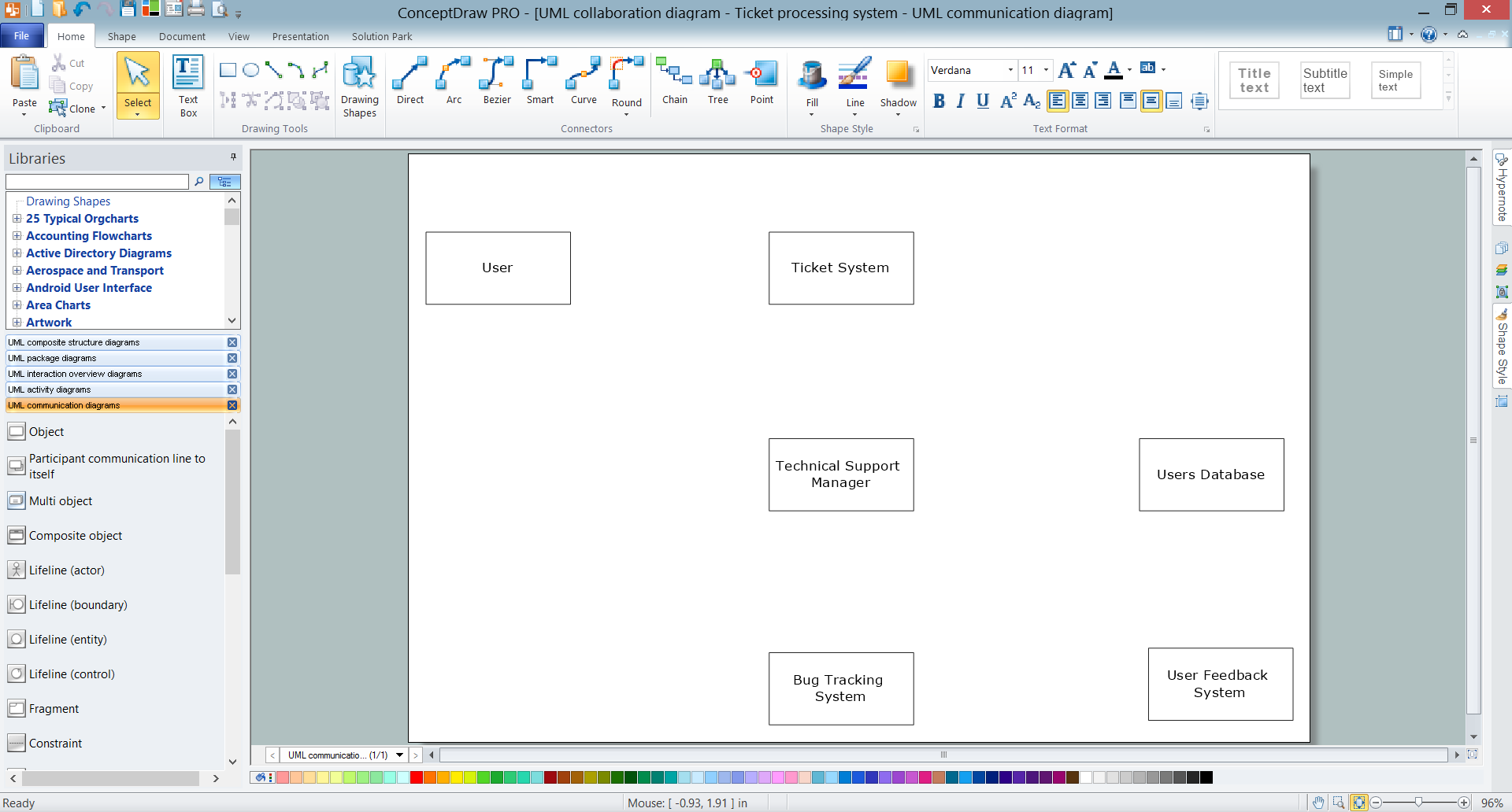 - drag the UML objects from the library which corresponds to your UML diagram type, add the text and arrange them on your document page;
