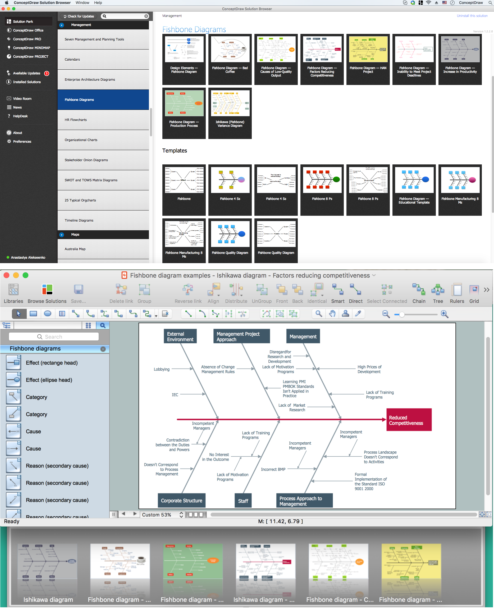 Fishbone diagrams work for most entrepreneurs and almost any industry or person having a problem. Professional diagramming software may help you create Fishbone (Cause and Effect or Ishikawa) diagrams. When people are unclear about what is causing an issue, ConceptDraw DIAGRAM will be your lifesaver.