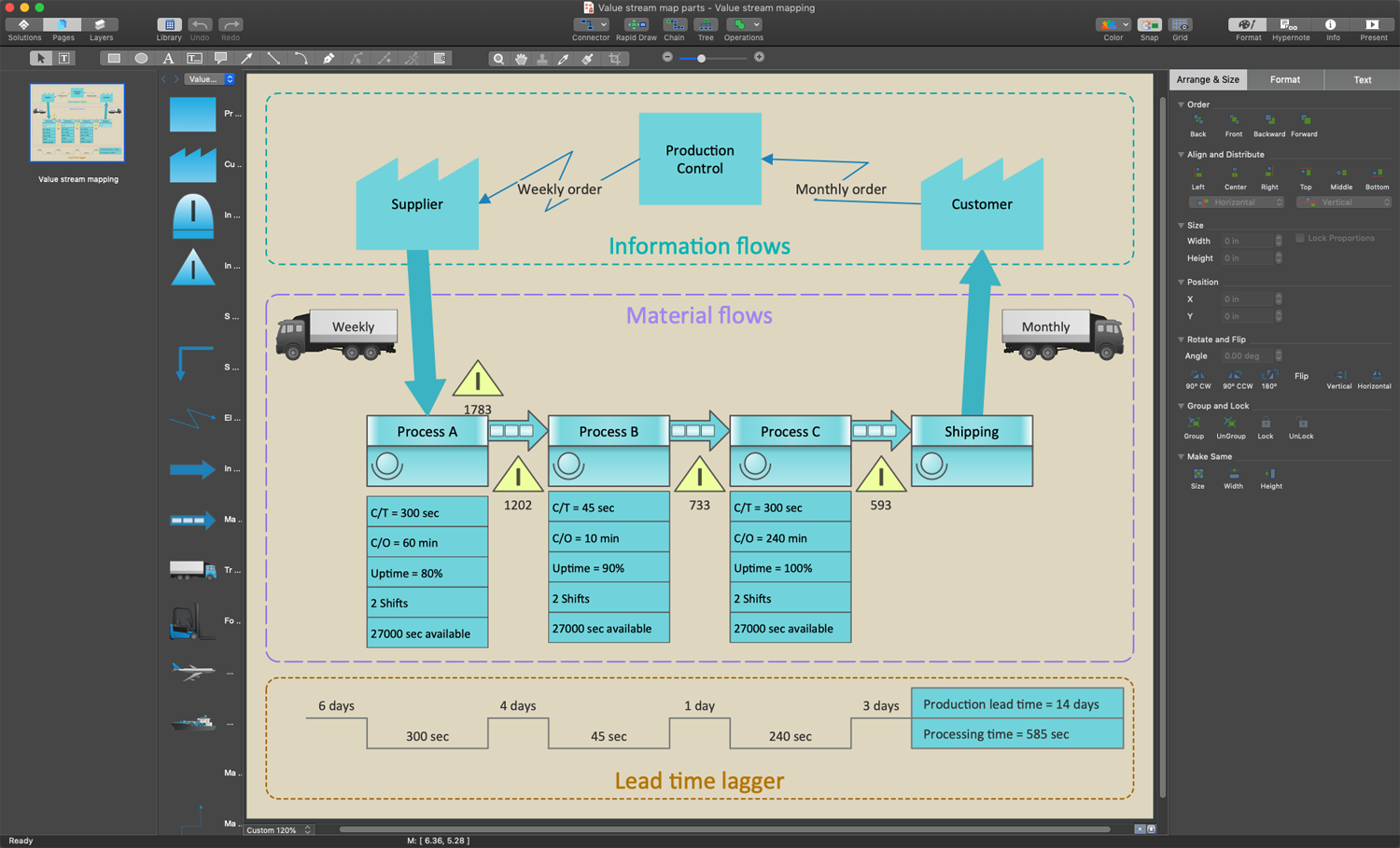 The Value Stream Mapping solution helps you simply design the easy-to-understand maps by utilizing a set of common VSM symbols. They are available from the solution's Value Stream Mapping library. You can also start your drawing with a Value Stream Map template.