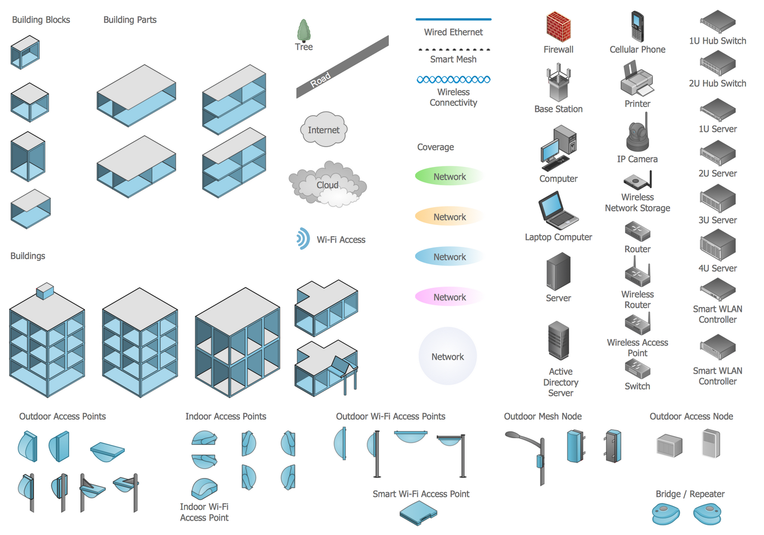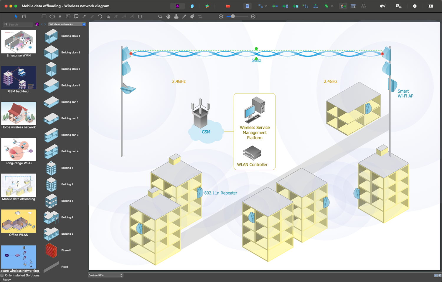 Wireless Networks solution from the ConceptDraw Solution Park extends ConceptDraw DIAGRAM vector diagramming software to help network engineers and designers efficiently design, create, and illustrate wireless networks of various complexity, purposes, and types. The solution contains a comprehensive library of objects for drawing different types of Wireless network diagrams and professionally designed wireless network diagram examples.