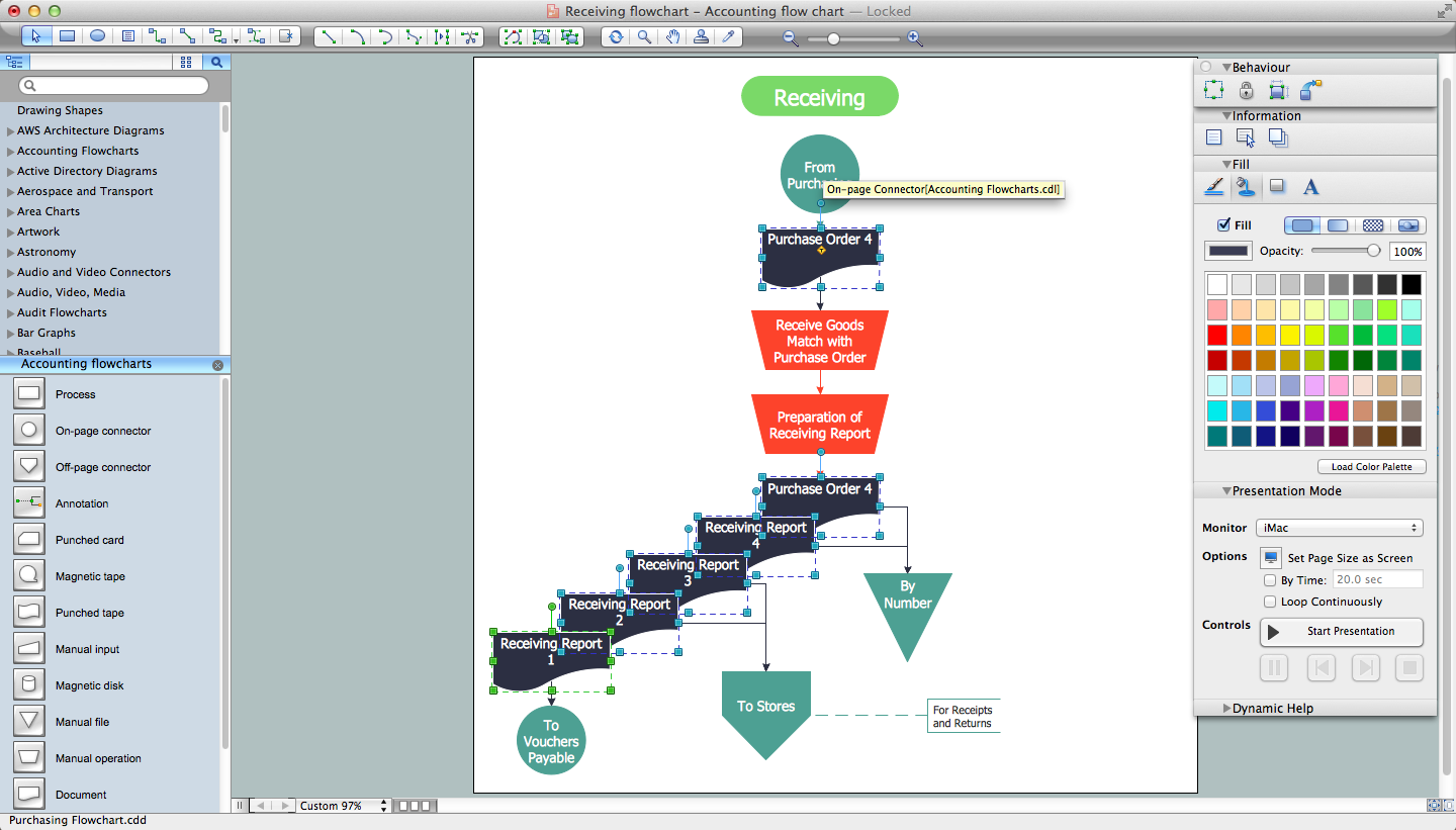 ConceptDraw DIAGRAM diagramming and vector drawing software extended with Accounting Flowcharts Solution provides the Accounting Flowcharts library with wide variety of predesigned accounting flowchart symbols, and the set of templates and samples allowing you design the accounting flowcharts and show the steps of accounting cycle in minutes.