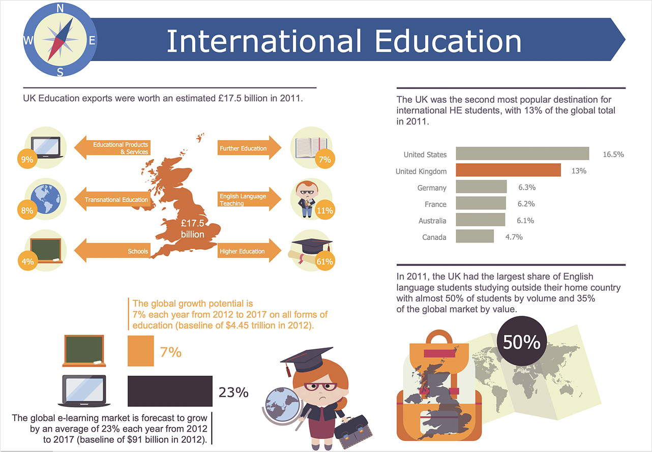 Education Infographics is used to display a lot of education-related information in a single, visually-appealing graphic. Infographics, created for education purposes can contain different illustrations, detailed charts, and data. ConceptDraw PRO can be used as a tool for creating education infographics. It allows you to draw infographics quickly and easily using the special templates and vector stencils libraries. Infographics can be used to quickly communicate a message, to simplify the presentation of large amounts of data, to see data patterns and relationships, and to monitor changes in variables over time. It can contain bar graphs, pie charts, histograms, line charts, e.t.c.HelpDesk