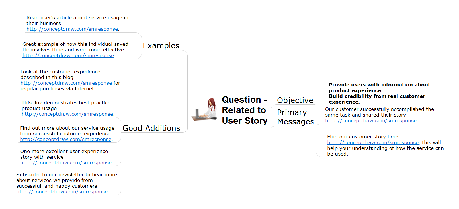 This solution extends ConceptDraw PRO and ConceptDraw MINDMAP with the ability to draw interactive flow charts with action mind map templates, to help create an effective response to applicable social media mentions.