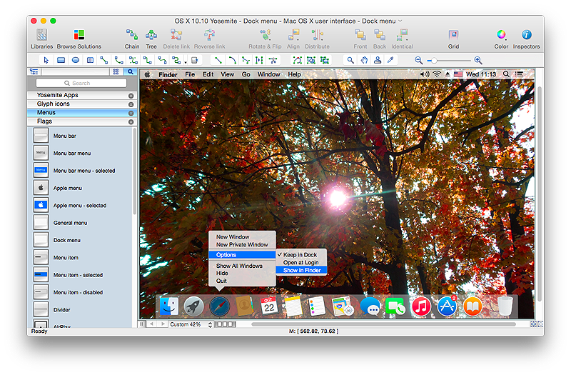 Since that first Macintosh, Apple have always developed and used their own hardware specific operating system. The fundamental style and layout of the Mac OS X user interface has remained largely in place since the earliest versions, but there have been obvious aesthetic enhancements, and elements of icon redesign to match branding across devices. To design an effective user interface, graphic designers will create visual GUI prototypes, that focus on maximizing the user experience. Uses Interface prototyping is much convenient when you can work through a diagram similar to the OS X design. ConceptDraw PRO allows you to develop Apple OS X User Interface (UI) prototypes using the special templates and vector libraries of the specific user interface elements. ConceptDraw Mac OS X UI solution offers libraries containing the distinct Mac app icons, menu bar graphics, glyph elements and other Mac OS X features — everything necessary to create high standard, professional UI graphic desigWhat Is User Interface?