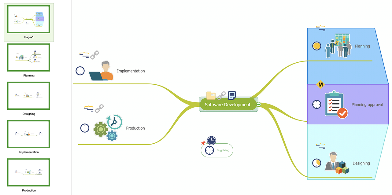 Classical mind map consists from the single Main Idea surrounded with related ideas and branches, deepening the main theme. The Multiple Main Idea on a single mind map page is a really useful when you have a lot of corresponding ideas. ConceptDraw MINDMAP allows you to insert a number of different mind maps onto a single workspace.HelpDesk