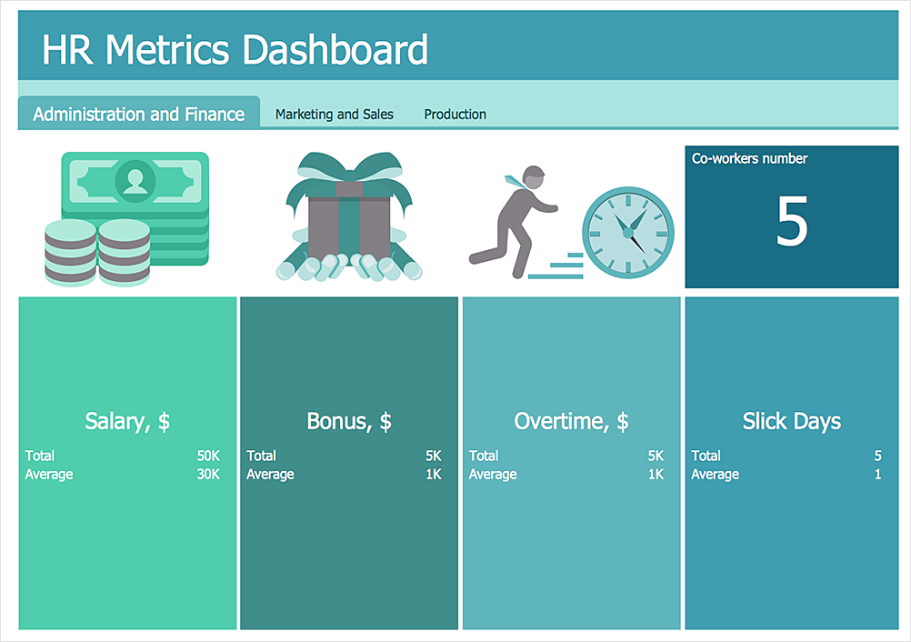 This HR dashboard template for ConceptDraw PRO software consits of column charts and icons.