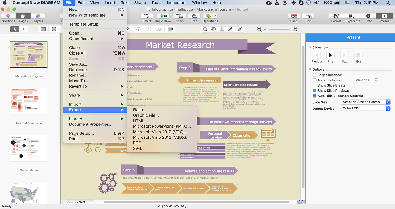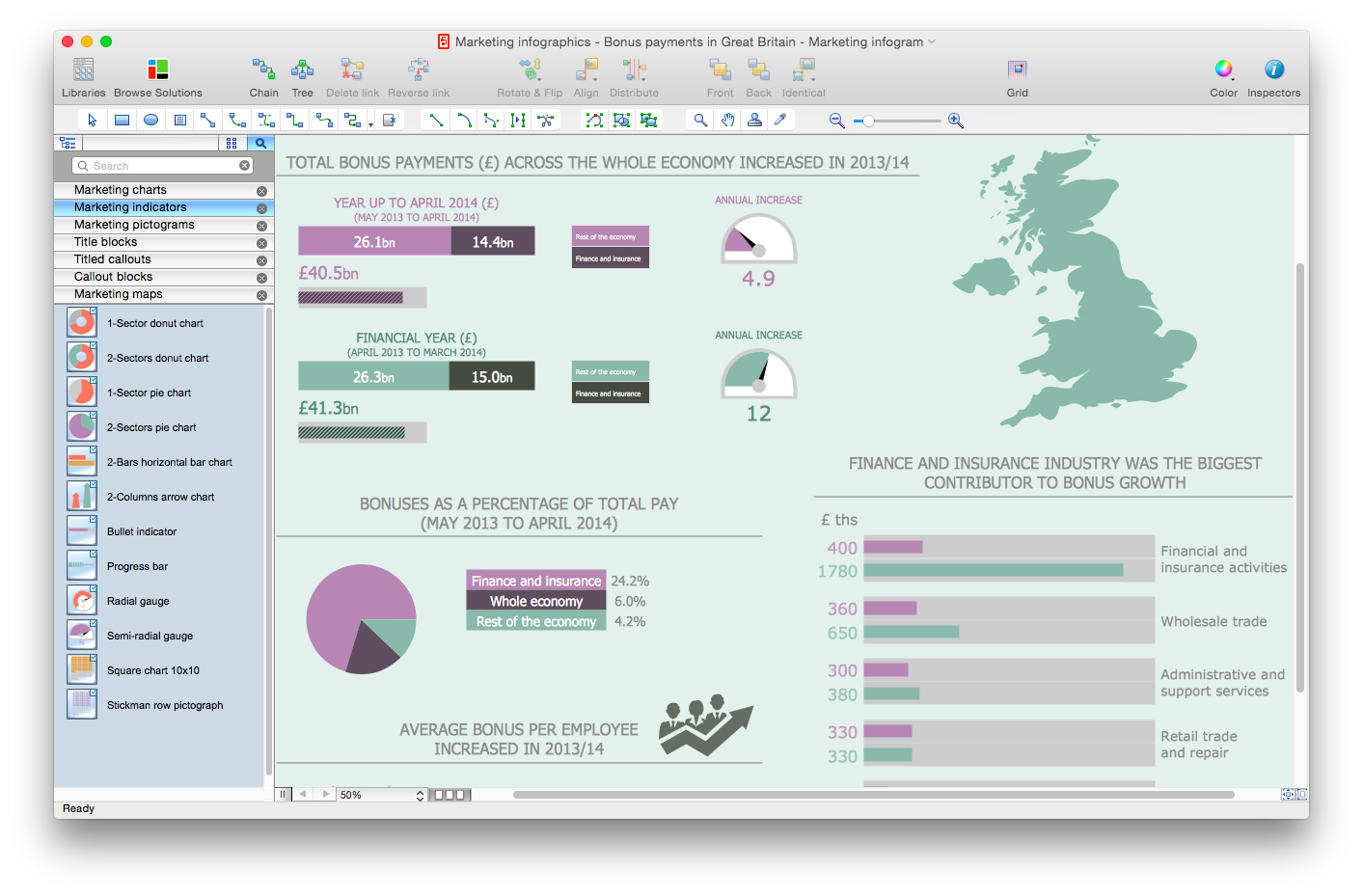 Marketing Infographics are used to quickly communicate a marketing message, to simplify the marketing presentation of large amounts of data, to see data patterns and relationships, and to monitor changes in variables over time. It can contain bar graphs, pie charts, histograms, line charts, e.t.c. Marketing infographics display a lot of information in a single, visually-appealing picture. ConceptDraw PRO can be used as a tool for creating marketing infographics. It allows you to draw marketing infographics quickly and easily using the special templates and vector stencils libraries.HelpDesk
