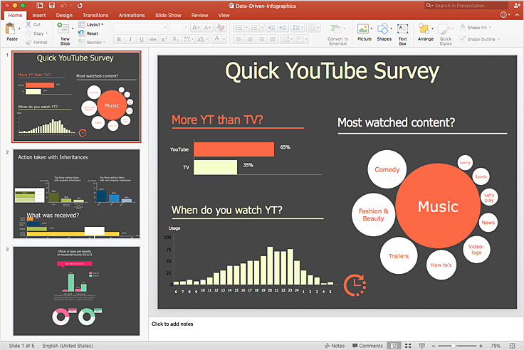ConceptDraw DIAGRAM can be used as a tool for creating data-driven infographics. It allows you to draw data driven using the special templates and vector stencils libraries. ConceptDraw DIAGRAM allows you to make a MS PowerPoint Presentation from your Data-driven infographics in a few simple steps.Excellent Examples of Infographic Maps