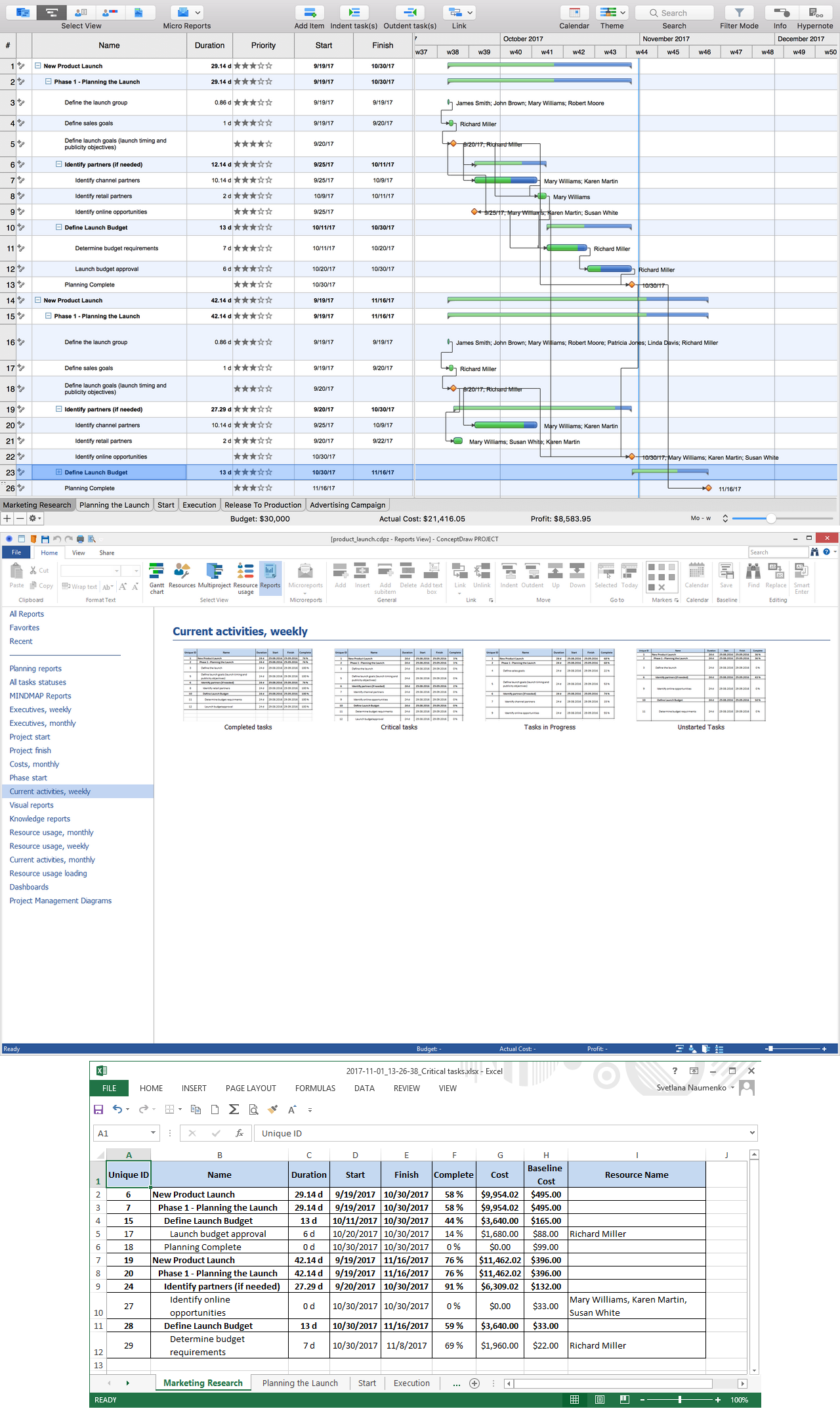 ConceptDraw PROJECT provides a user with the possibility to track how the project is going. Project Manager can compare the actual data with the planned and assess possible measures to resolve issues. ConceptDraw PROJECT has several types of visual reports that can help to assess visually the difference between planned and actual project data.