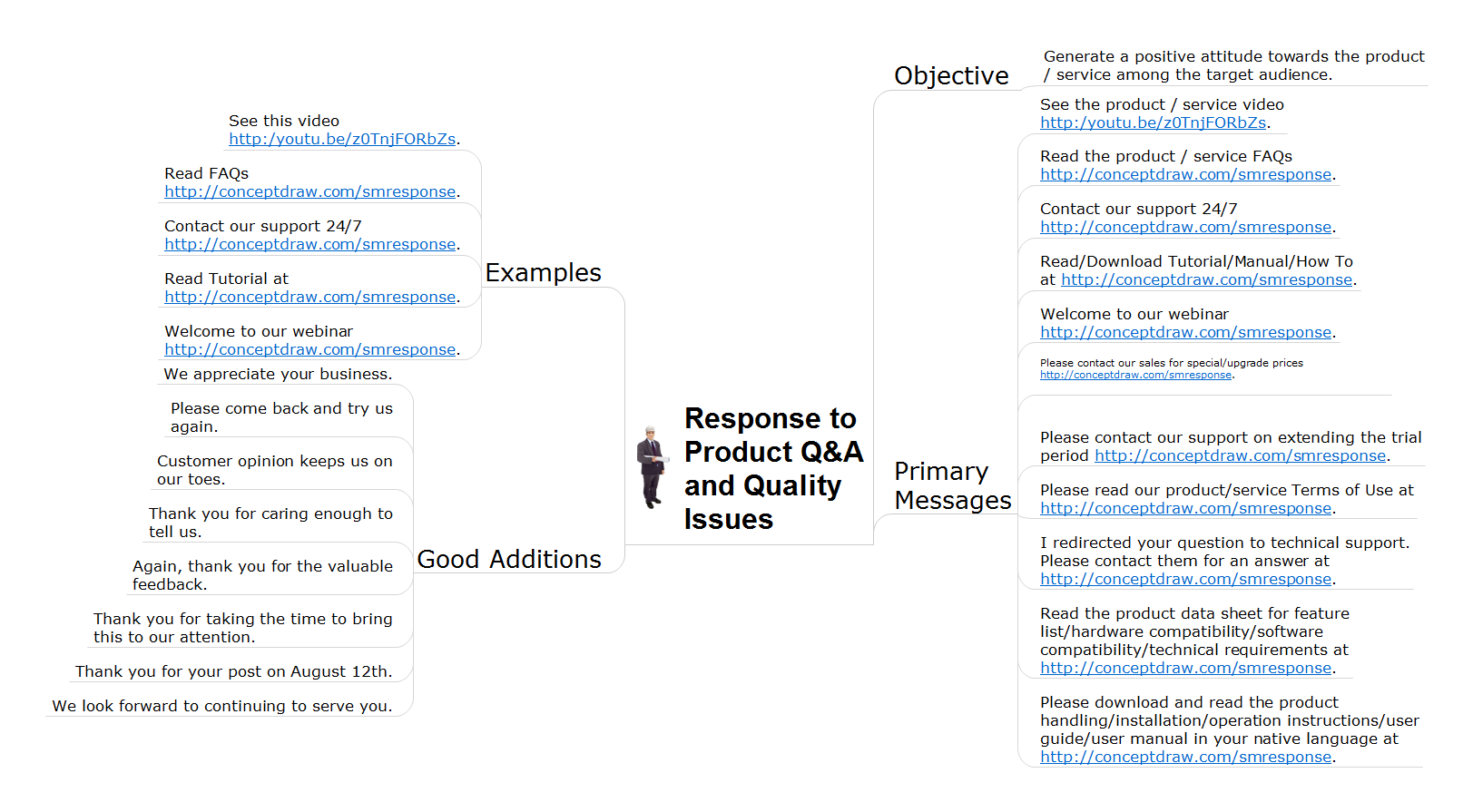 Response to Customer Questions - ConceptDraw DIAGRAM provides tools to develop a response flowchart that can be connected with Action Mind Maps. Visual navigation through the stages of a response process helps you locate specific actions to be taken via Action Mind Maps. Action Mind Maps can be used to describe primary messages and good additions, show examples of messages, and also define the main objective of messaging for a specific situation.Address to User Story Question
