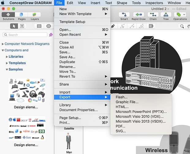 - Finally, you can export your drawing as MS PowerPoint® and Adobe PDF files using Export options from the File menu.