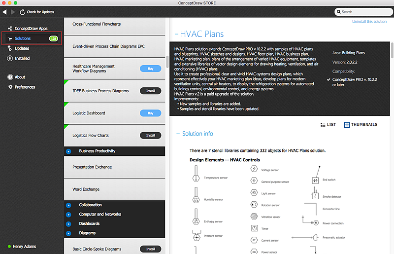 If you have ConceptDraw solution already installed, you can preview its full content on the right panel. You can easily access stencil libraries, templates, and samples directly from the ConceptDraw STORE by clicking the corresponding preview icons. |