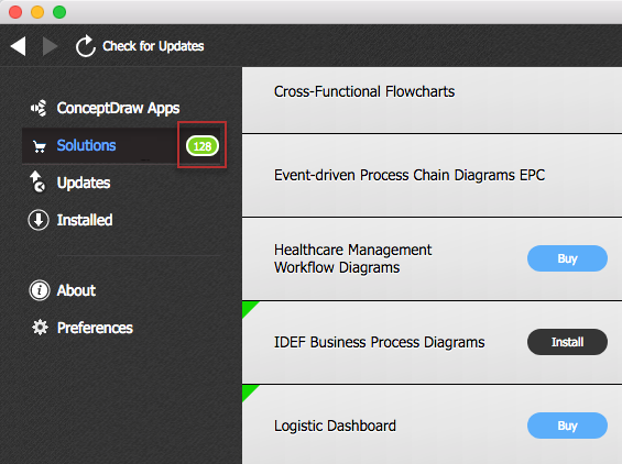 You can see the number of new solutions that are not installed on your computer yet. Solutions tab displays a list of all ConceptDraw solutions and possible operations depending on the license status. Solutions that you have not viewed are marked with a green triangle