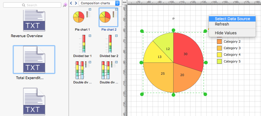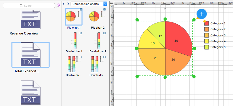 The “Dashboards” area of the ConceptDraw Solutions collects basic types of Visual Dashboards. Here you can find common types of charts and indicators combined into typical Visual Dashboards. In ConceptDraw DIAGRAM you can easily create a visual dashboard using charts and graphics indicators from Live Objects libraries. Then you can connect the Live Objects with data source files to visualize the actual values of your performance metrics. Live Objects of different types can use data source files of different formats: TXT, CSV, or XLSX. This article explains how to connect a ConceptDraw live object with data source files in TXT format to visualize the actual values of your performance metrics.
