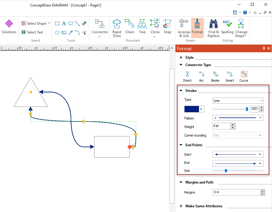 - ConceptDraw DIAGRAM provides you with the possibility to set up a connector so that it does not have a visible connection to the objects by adding two-sided margins, or one-sided indents (Path). Thus, a part of the connector becomes invisible, but it will still be glued to connection points on objects.