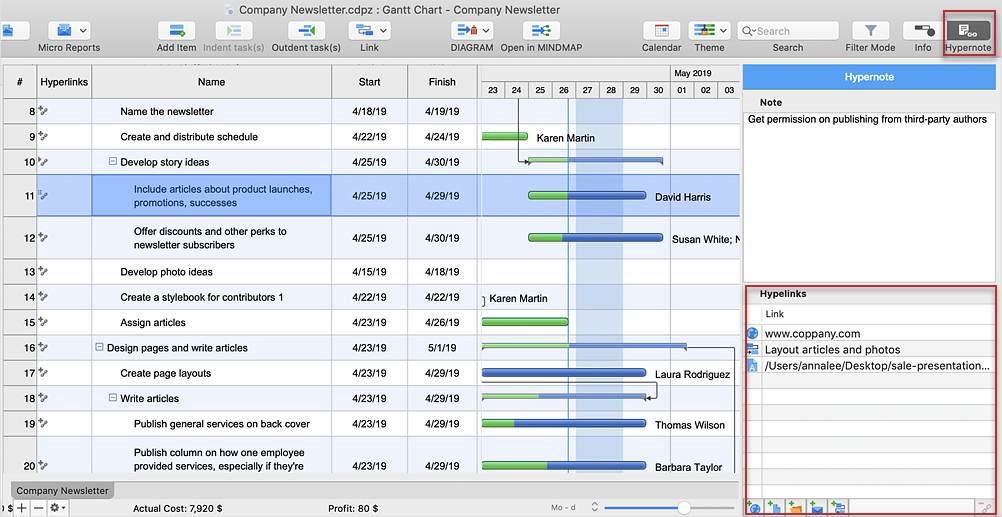 How to Connect a Single Project ItemsEach item in the single project file (Project, Task, and Resource) can be connected by a hyperlink to any object within the current document, such as a Project, Task, Phase or Resource. You can manage hyperlinks using the Hypernote panel. This side panel combines together the function of adding and editing text notes and hyperlinks, being previously divided between the Text Note and Hyperlink panels.