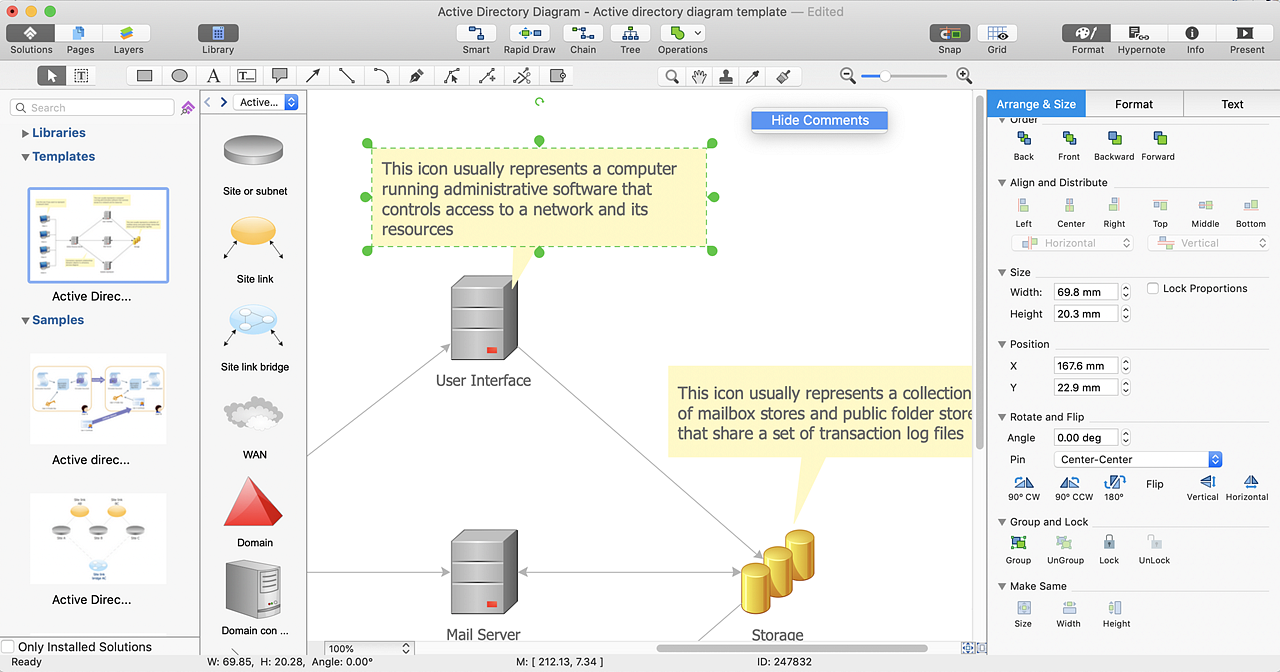 - The template provides you with some callout hints that can be useful when building an Active Directory diagram. You can manage the visibility of hints using the Action button
