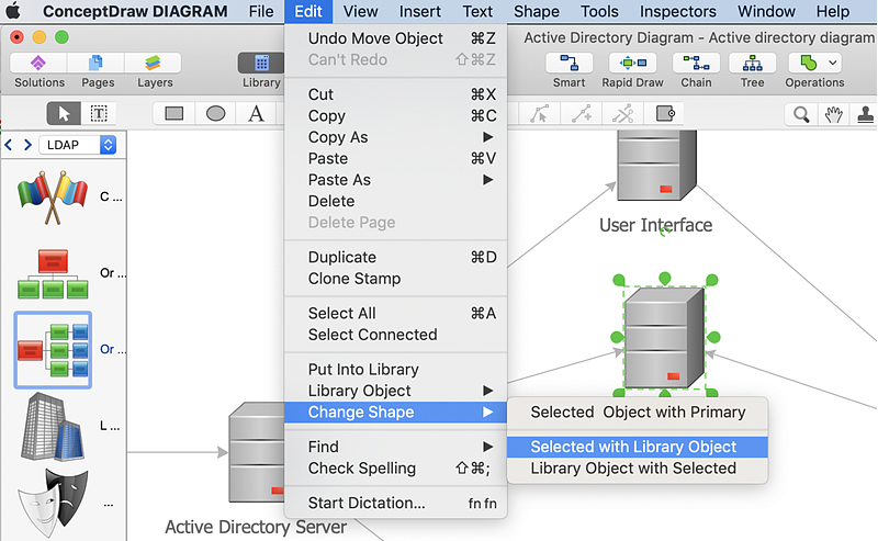 - Any object in the template can easily be replaced with a library object using the Change Shape command. Find it in the menu Edit on macOS, and in the object context menu on Windows.