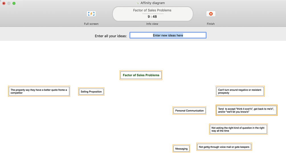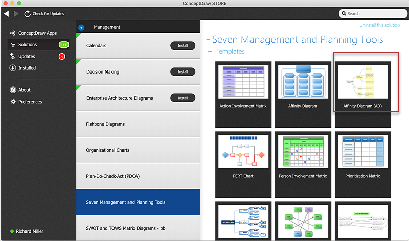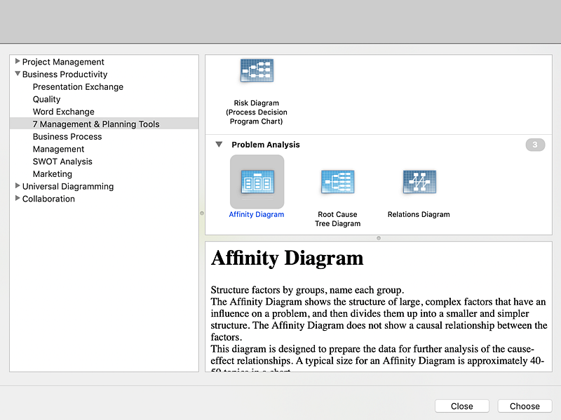 How To Create an Affinity Diagram Using SolutionsThe Affinity diagram shows the structure of large, complex factors that have an influence on a problem, and then divides them up into a smaller and simpler structure. We recommend using a mind map for Brainstorming and collecting the factors affecting the problem. Affinity diagram helps to group a large number of ideas, using their relationships, and can also be used to: analysis of complex problems, analysis of some poll results, analysis of ideas after brainstorming, or any other analysis whenever the number of options reaches “the chaos limit”. The ability to create an Affinity diagram from a mind map is supported by the Seven Management and Planning Tools solution. This solution will be installed for both MINDMAP and DIAGRAM.