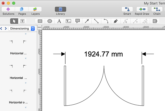 - Use the Dimensioning library to show the sizes, corners, squares and other technical details using the current measurements of units. Select a dimension and insert it into the document by double-clicking. Move the dimension object to connect its lines with a connecting point of the layout object.