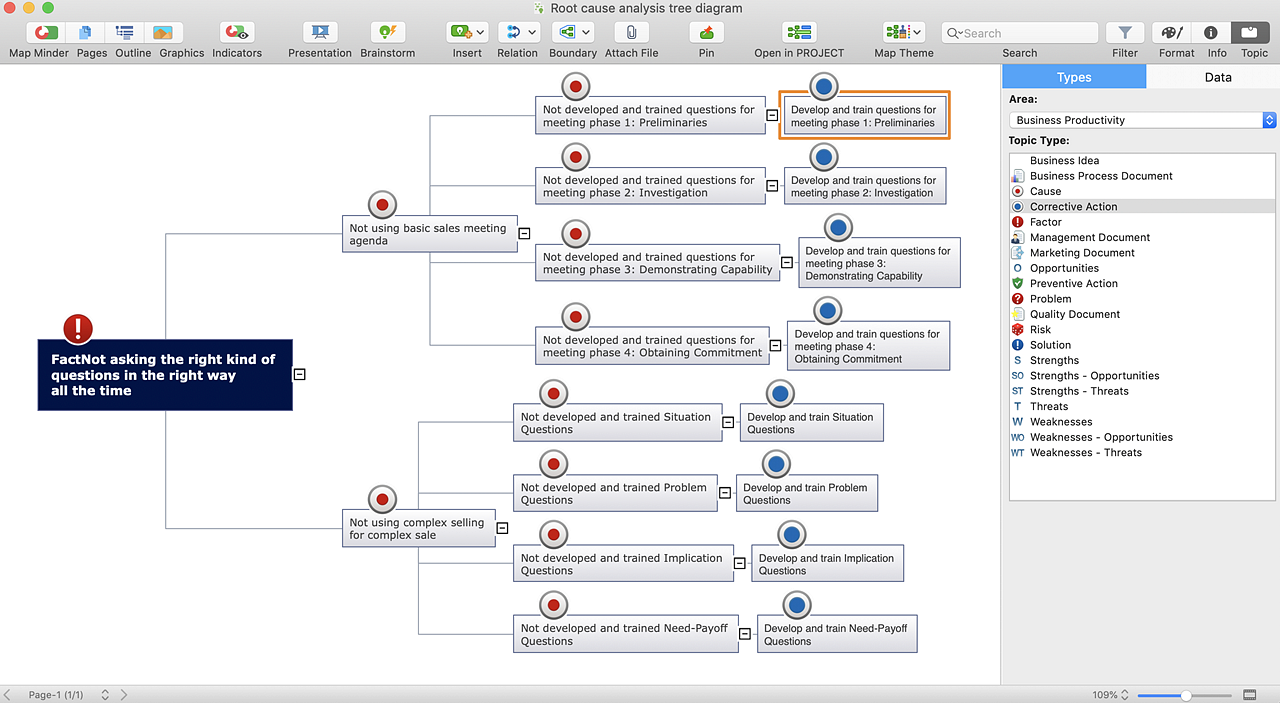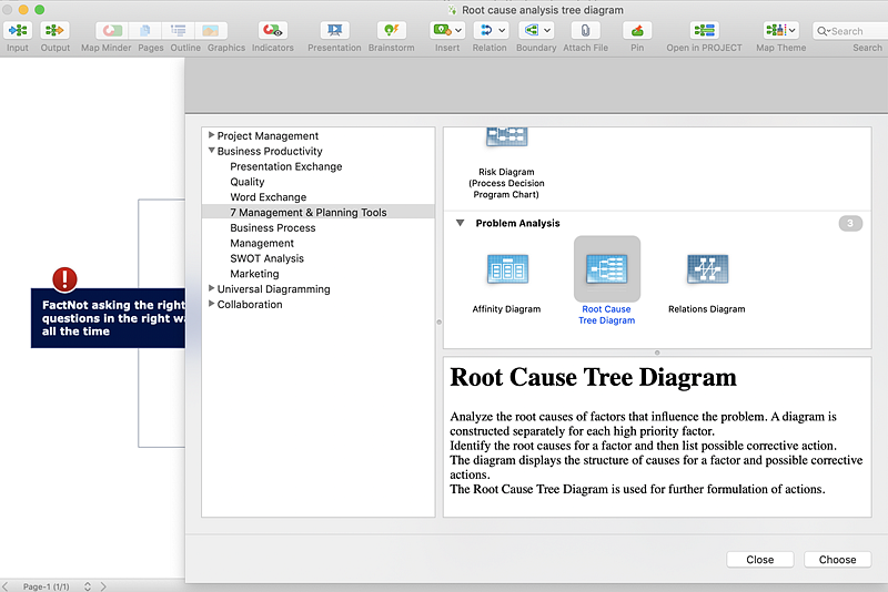 How To Create Root Cause Analysis Diagram Using SolutionsRoot Cause Analysis (RCA) is a technique that helps people find out the reason for the occurrence of the problem. It is used to identify the cause of a problem using a special set of steps, to find the root cause of the problem. It helps to determine what has happened, why the problem took place and reduce the probability of the problem recurrence. Root Cause Analysis (RCA) diagram displays the structure of causes for a factor and possible corrective actions. A diagram is constructed separately for each high priority factor. Analyze the root causes of factors that influence the problem. Identify the root causes for a factor and then propose possible corrective actions. The ability to create an RCA tree diagram from a mind map is supported by the Seven Management and Planning Tools solution. This solution is installed for both ConceptDraw MINDMAP and ConceptDraw DIAGRAM.