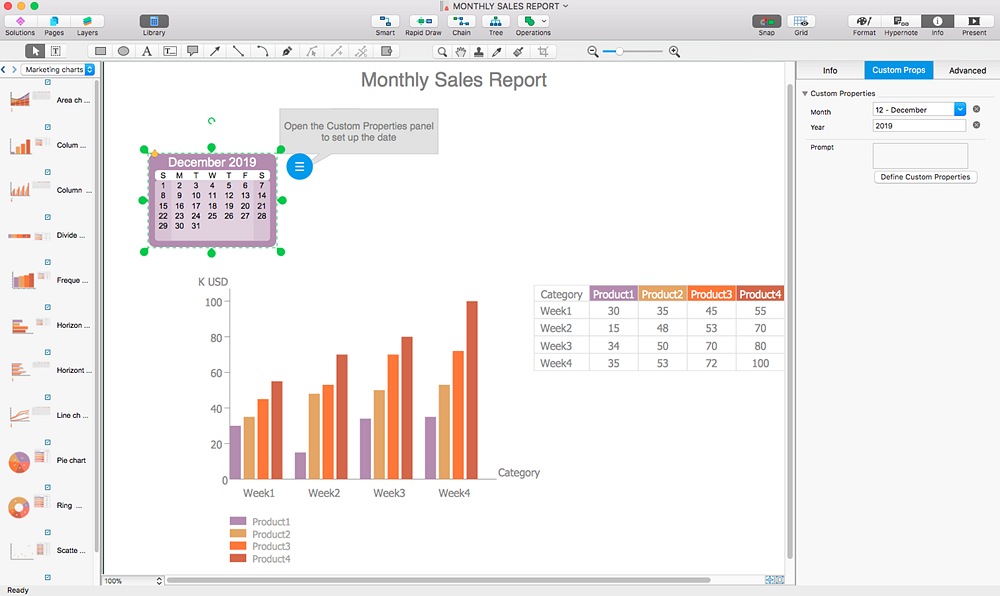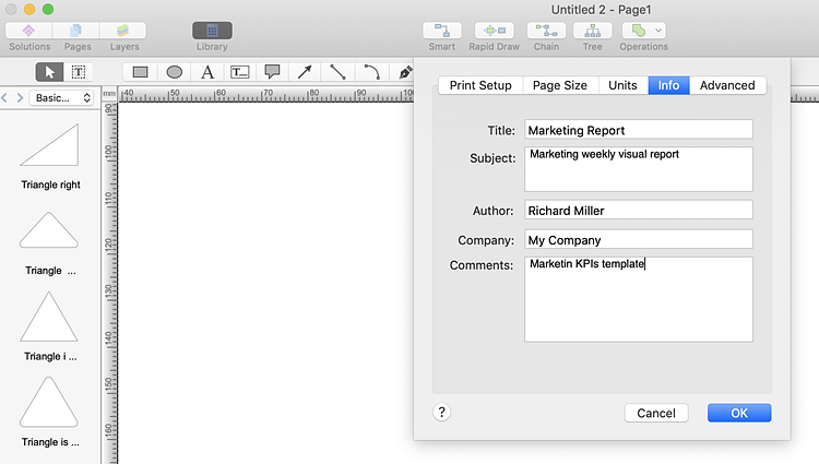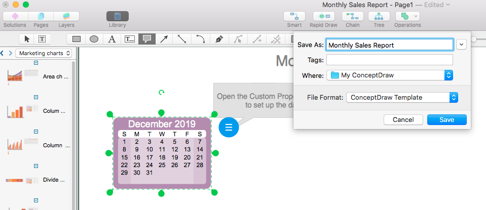How to Create the Custom Diagram TemplateConceptDraw DIAGRAM provides a number of templates that are supplied with Solutions. ConceptDraw DIAGRAM lets you create and customize your own diagram templates. A template diagram is a drawing that serves as a starting point for a new graphics document. When you open a template, it is pre-formatted in some way. The custom template would likely have a workspace and corresponding object libraries. When you save a file created with a template, you are usually prompted to save a copy of the file, so that you don't save over the template. Templates can either come with a proper solution or can be created by the user. If you find yourself creating similar documents over and over again, it might be a good idea to save one of them as a template. Then you won't have to format your documents each time you want to make a new one. Just open the template and start from there. Thus you do not need to set up the work-space and document properties each time when you start creating your favorite drawings. You can apply the diagram template that you previously saved.