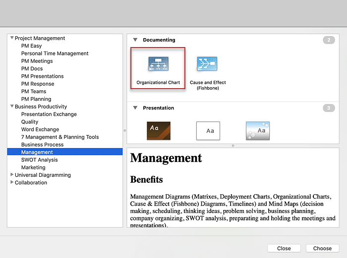 - From ConceptDraw MINDMAP Outputs, choose the Management category and run the Organizational Chart output.