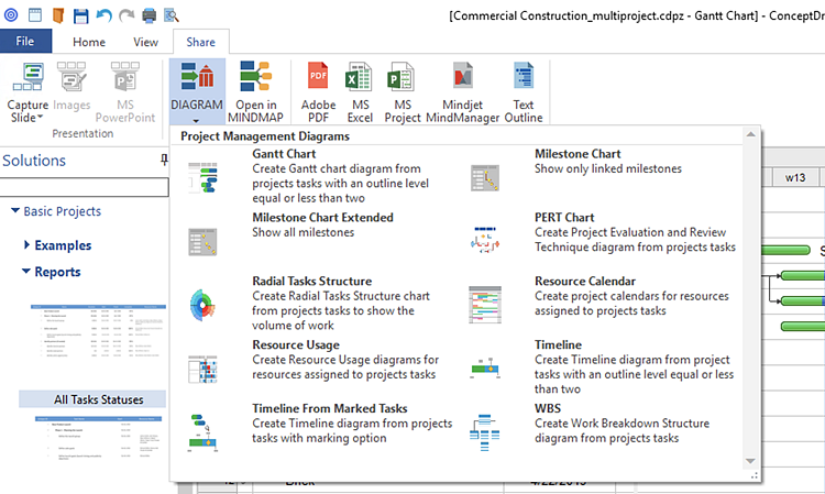 How to Create Project Diagrams on PCProject management diagrams give you the ability to view at a detailed level project attributes such as project scope, logical connections in the project, critical paths, key events on the timeline, milestones, tasks, calendars for work, and resource utilization. Transforming project data into different visual forms is a productive way of looking at your project from different perspectives. It also helps you deliver project information in a suitable way depending on your objectives and audience. The ability to create project diagrams using ConceptDraw OFFICE is delivered by a special solution. To accomplish this you should have ConceptDraw PROJECT, ConceptDraw DIAGRAM, and the PM Easy solution installed. ConceptDraw PROJECT allows generating of 9 types of visual project diagrams: Gantt Chart, Milestones chart, PERT chart, Radial Structure chart, Resource Calendar, Resource Usage diagram, Timeline, Timeline From Marked Tasks, and WBS chart. The diagram will be generated in ConceptDraw DIAGRAM format (CDDZ).