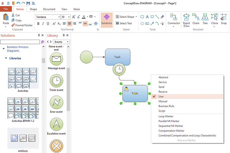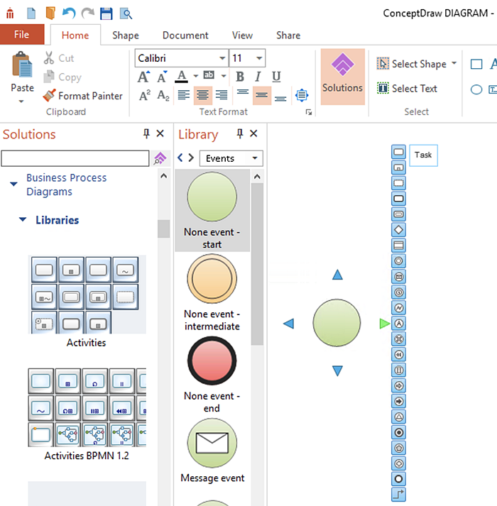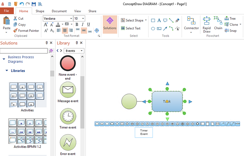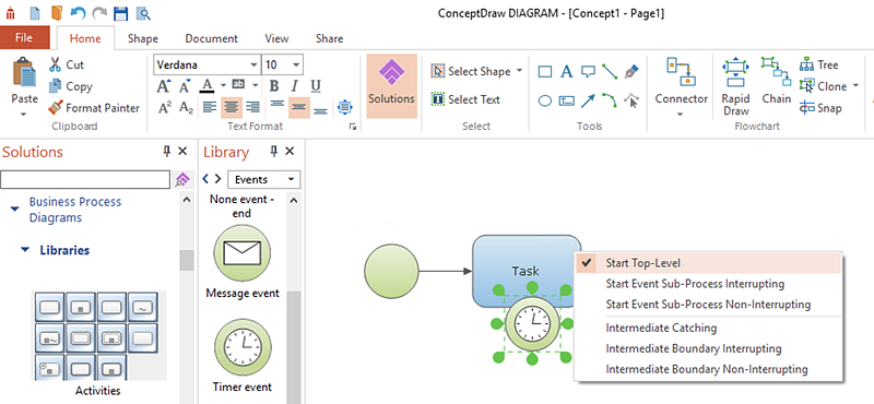 How to Create a BPMN DiagramBusiness Process Modeling Notation (BPMN) is a method of illustrating business processes in the form of a diagram. A diagram in BPMN is assembled from a small set of core elements, making it easy for technical and non-technical observers to understand the processes involved. The Events (expressed as circles) indicate when some event occurs at the start, end or during a process. Events that occur during an activity is known as a Border Event. For example, you may be assigned a task with a deadline. The deadline would be shown as a timed event on a human task activity. The ability to design business process diagrams is contained in the Business Process Diagram solution. This solution extends ConceptDraw DIAGRAM with 16 libraries that contain 230 vector objects from BPMN 1.2 and BPMN 2.0 that can be used when representing any business processes.