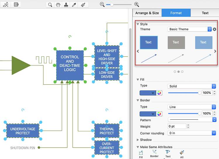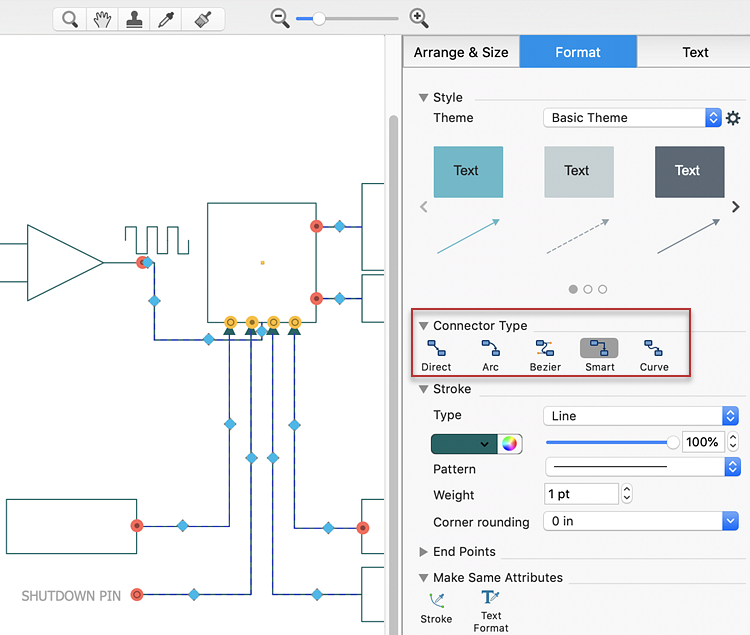 . To connect elements using this tool, drag the connector from one connect dot to another.
