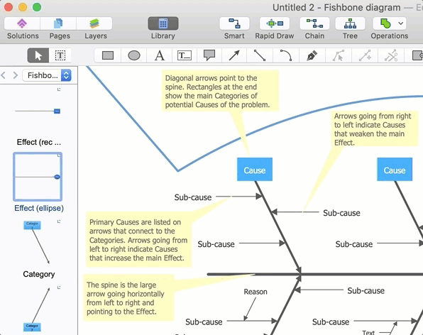 How to Draw a Fishbone DiagramA Fishbone (Ishikawa) diagram is also called cause-and-effect diagram. Fishbone diagram is often used in business to determine the cause of some problem. The diagram illustrates the main causes and sub-causes leading to an event. The main goal of the Fishbone diagram is to illustrate in a graphical way the relationship between a given outcome and all the factors that influence this outcome. The complete diagram resembles a fish skeleton as its name implies. The ability to create a Fishbone Diagram is supported by the Fishbone Diagram solution. The easiest way to draw a diagram is to edit a template.