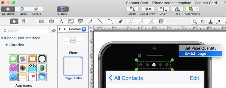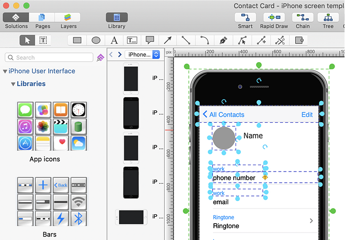 The products of Apple Inc have noted innovators of mobile devices, popularizing many interface standards, such as touchscreen and app technologies. Development of successful iPhone App UI requires a planning and prototyping stage. For user interface developers, designers and admen, working on apps market promotion, iPhone UI prototype diagrams can help illustrate certain points, and convey messages about usability. Using ConceptDraw DIAGRAM with the iPhone User Interface solution, that consists from 9 libraries, containing 153 vector shapes from iPhone graphical user interface, you can create professional looking UI diagrams that showcase iPhone 6 applications and technology.
