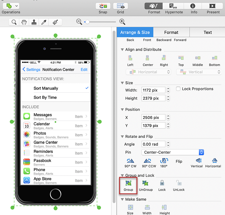 - You can use the command Group provided in the Arrange & Size panel to group the interface elements. Grouping related objects lets you rotate, move and re-size them together, as though they were a single object.