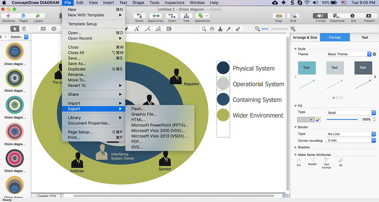 How to Create a Stakeholder Onion DiagramStakeholder Onion Diagram is a tool for identifying and investigating relationships of stakeholders to project goals. The primary difference that separates the onion diagram from other types of project oriented diagrams is the focus on the project goals. ConceptDraw's Stakeholder Onion Diagram solution is a paid add-on for ConceptDraw DIAGRAM There are 3 libraries containing 91 objects, that help make short work of visualizing the stakeholder analysis of a system.