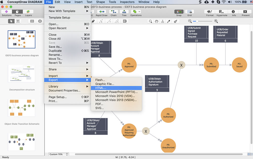 Using ConceptDraw DIAGRAM you can save diagrams as a Web pages. ConceptDraw DIAGRAM adds the HTML tags that are needed to display your diagrams in a Web browser, so all you have to do is design their appearance.