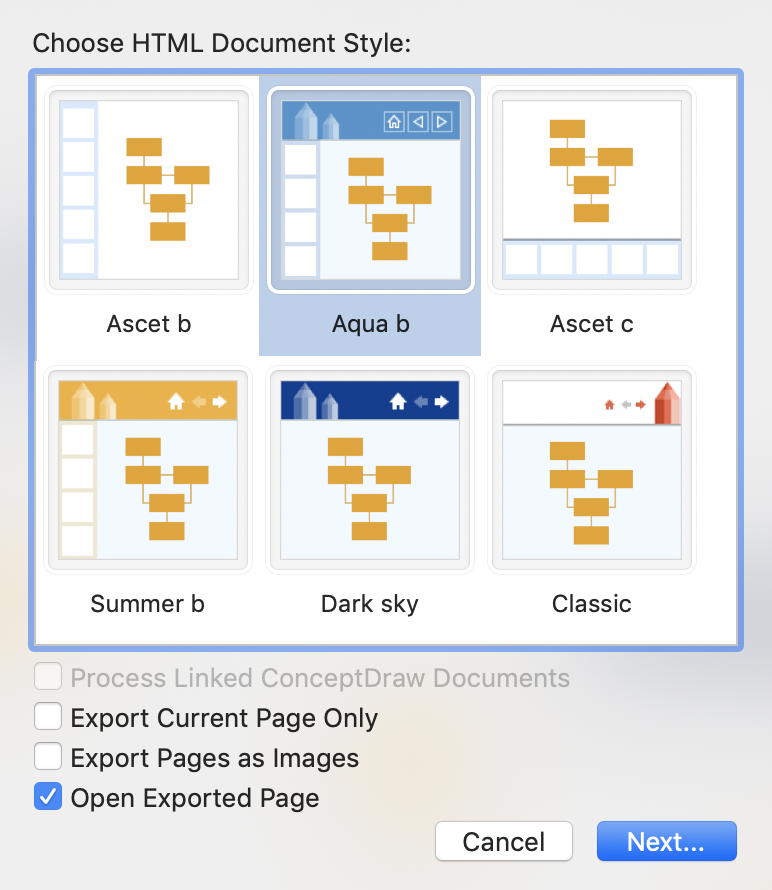 - At the HTML Export Wizard, select a template and enable the desired options.