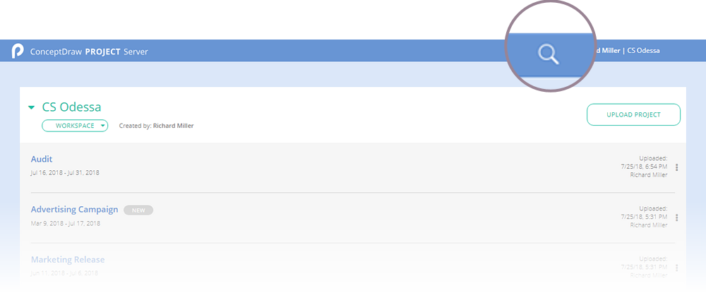 ConceptDraw PROJECT Server can accumulate a number of project files: projects uploaded by owner projects that are shared with owner projects uploaded by invited users and a set of example projects. You can open any projects from your own workspace and projects from workspaces you were invited. In addition, projects from Example Projects Workspace are available. Projects are sorted by date and time from the newest to the oldest by default.
