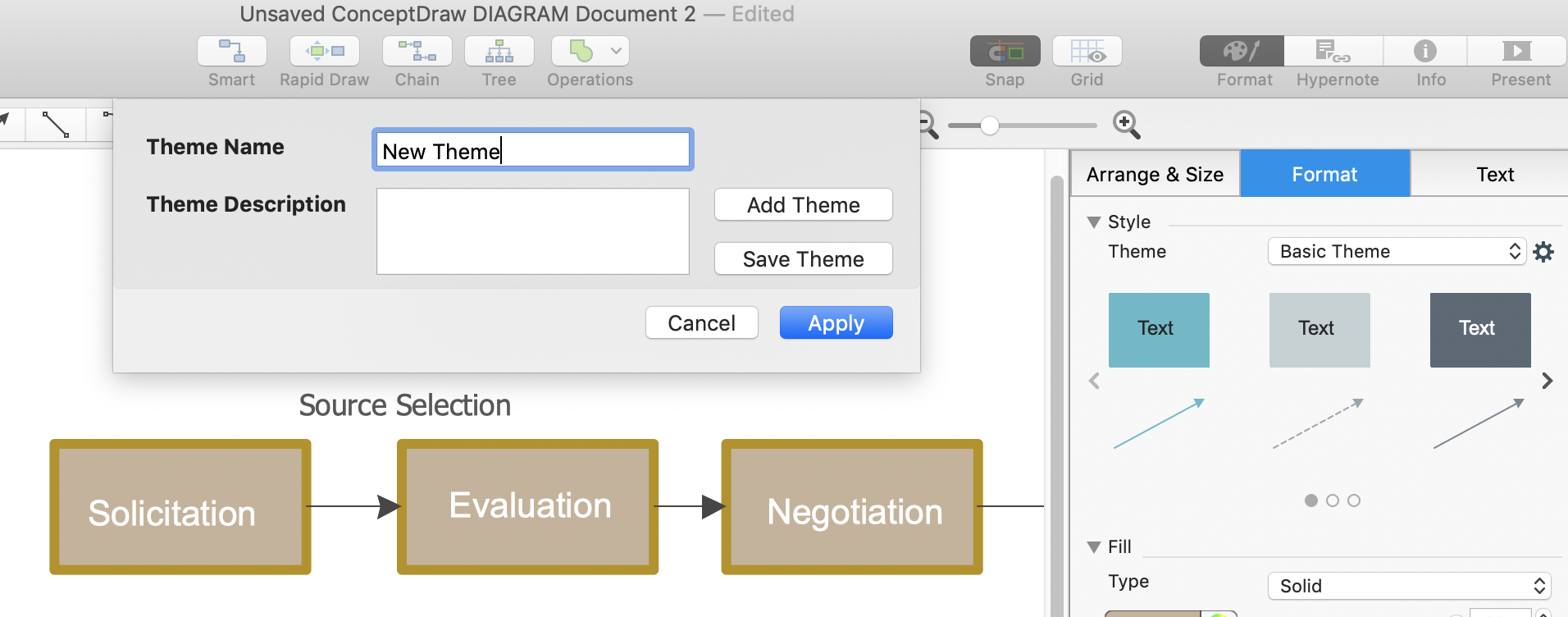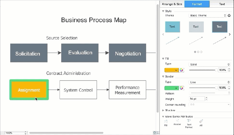 How to Apply the Same Formatting to Different ObjectsConceptDraw DIAGRAM provides two ways you can use to quickly format objects. You can apply pre-designed color schemes and formatting to your drawing with one click using Styles section in the Format panel. Applying a pre-designed style to selected objects is a quick way to make your drawings professionally looking. Another way is using Make Same tool on the Arrange&Size panel to spread formatting across multiple objects. Embedded Style Themes