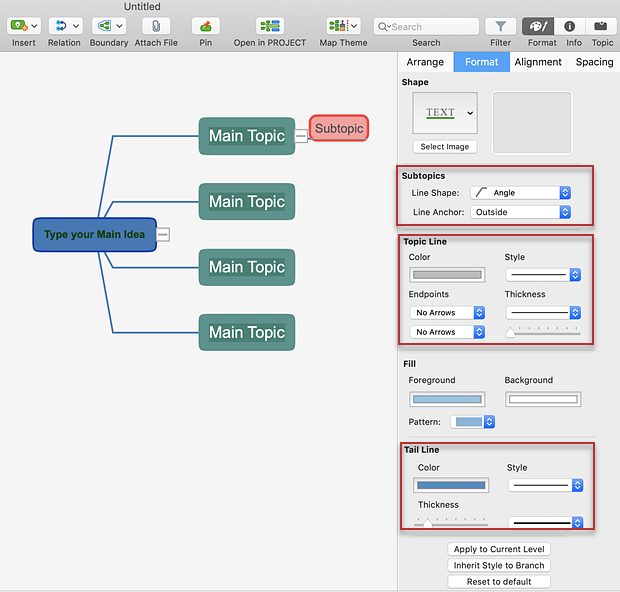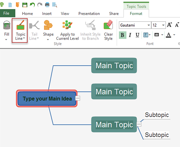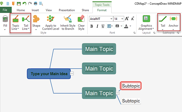 - To format a subtopic‘s line and tail, select the parent topic and use the Tail Line, Tail and Anchor tools in the Format tab (Windows).