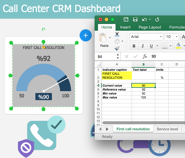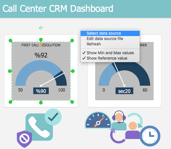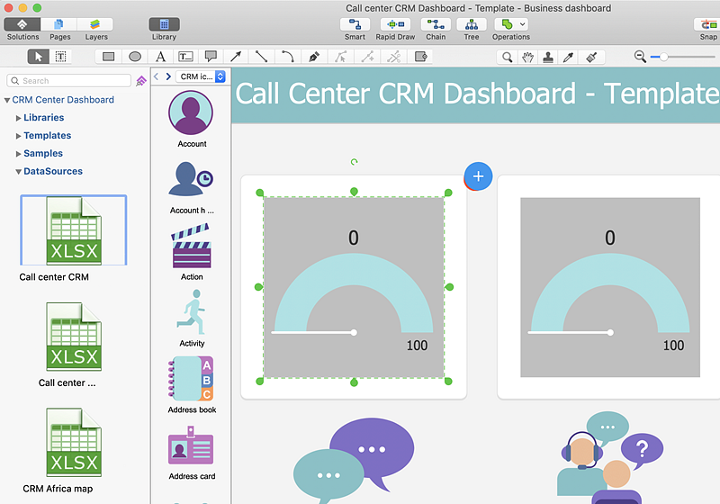 How To Create a CRM System DashboardCustomer Relationship Management is a strategy for managing business performance. Organizations use CRM systems to analyze and compile information on customers and manage interactions with customers and leads. It helps to improve business relationships with customers, assisting in customer retention and driving sales growth. CRM Dashboard is used to monitor the CRM system's data and reports, to provide an interactive overview of business performance using charts, graphs, and maps. The set of professionally designed CRM samples and templates included to the CRM Center Dashboard solution helps create CRM Dashboards and CRM Center Dashboards quickly. There are 5 stencil libraries containing 192 vector objects and pictograms. It allows displaying the interactive data by connecting with the data source file.