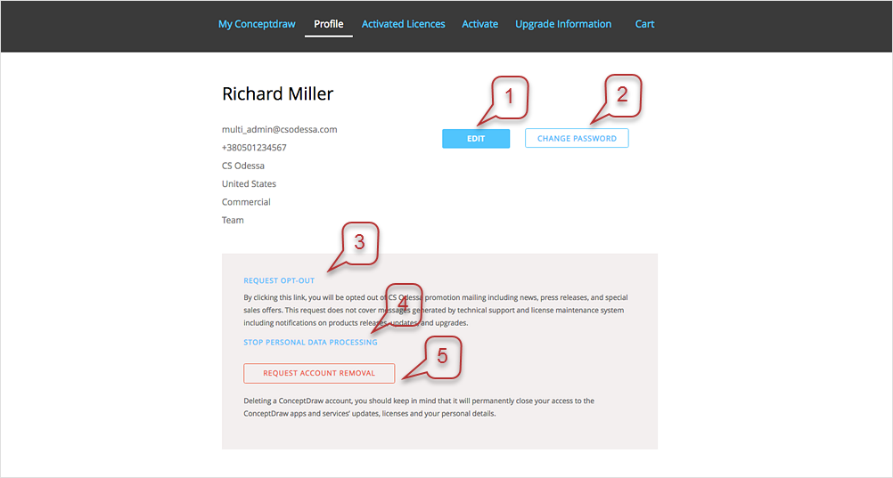- The Profile page on www.conceptdraw.com provides you with the possibility to manage your credentials: