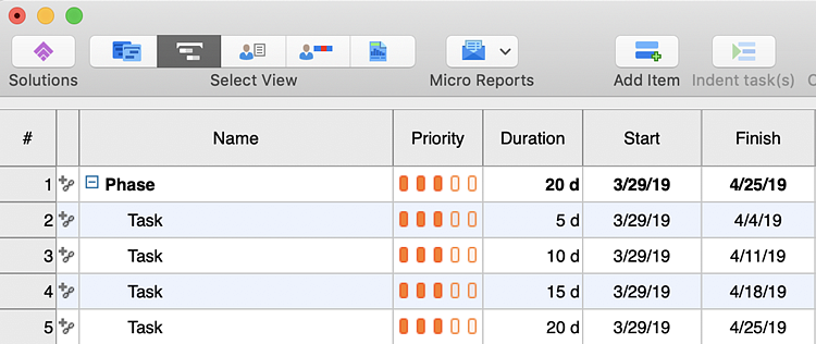 When you create an automatically scheduled task, ConceptDraw PROJECT sets the current date as the project start date and assigns it an estimated duration of one day by default.