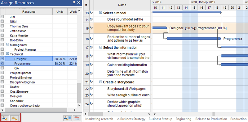 - Select a resource and click the checkbox to assign it to the selected task.