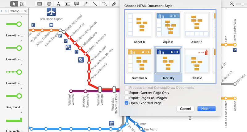 ConceptDraw DIAGRAM enables designing metro maps, route maps, and various transport schemes. You can easily make a map, and save it as a Web page. ConceptDraw DIAGRAM adds the HTML tags needed to display your drawings in a Web browser, so all you need is creating their appearance.